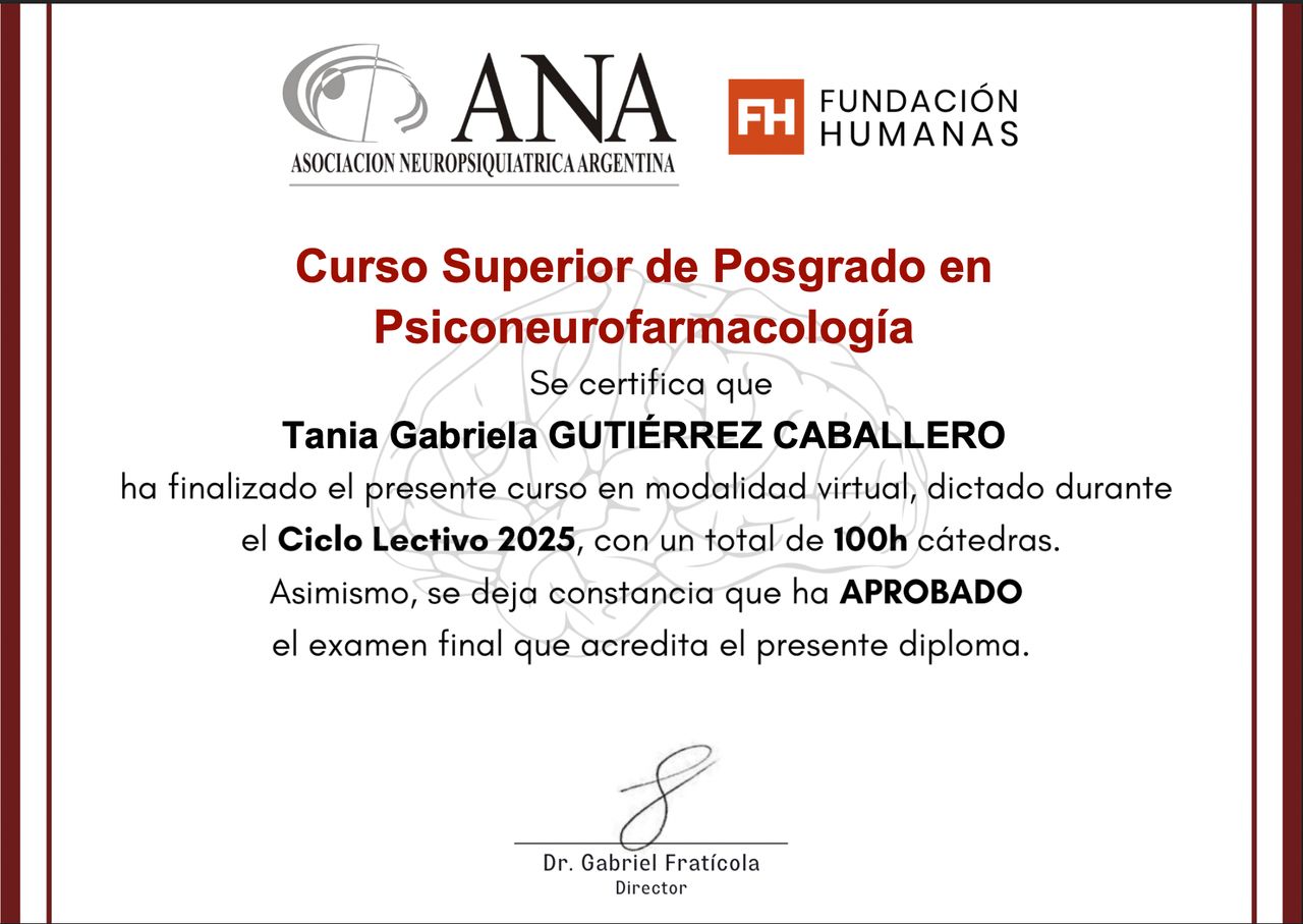 - Curso Superior de Posgrado en Psiconeurofarmacología por la Asociación Neuropsiquiátrica Argentina