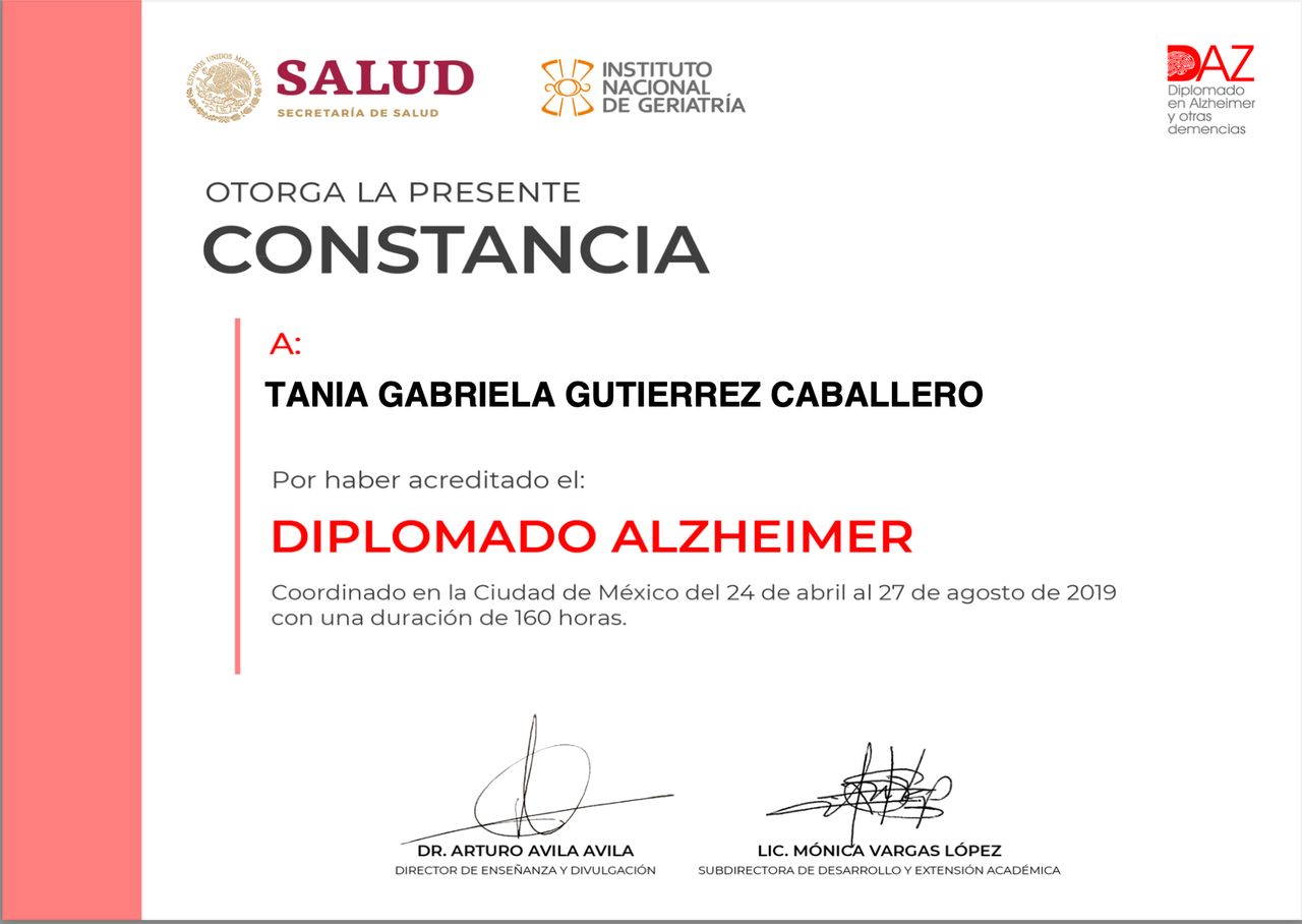 - Diplomado en Alzheimer por el Instituto Nacional de Geriatría