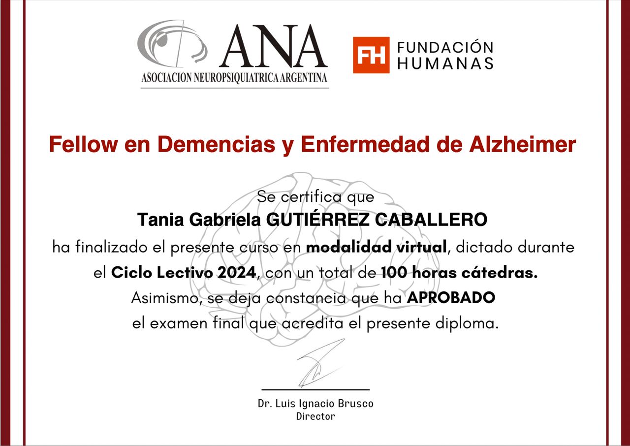 - Fellow en Demencias y Enfermedad de Alzheimer por la Asociación Neuropsiquiátrica Argentina