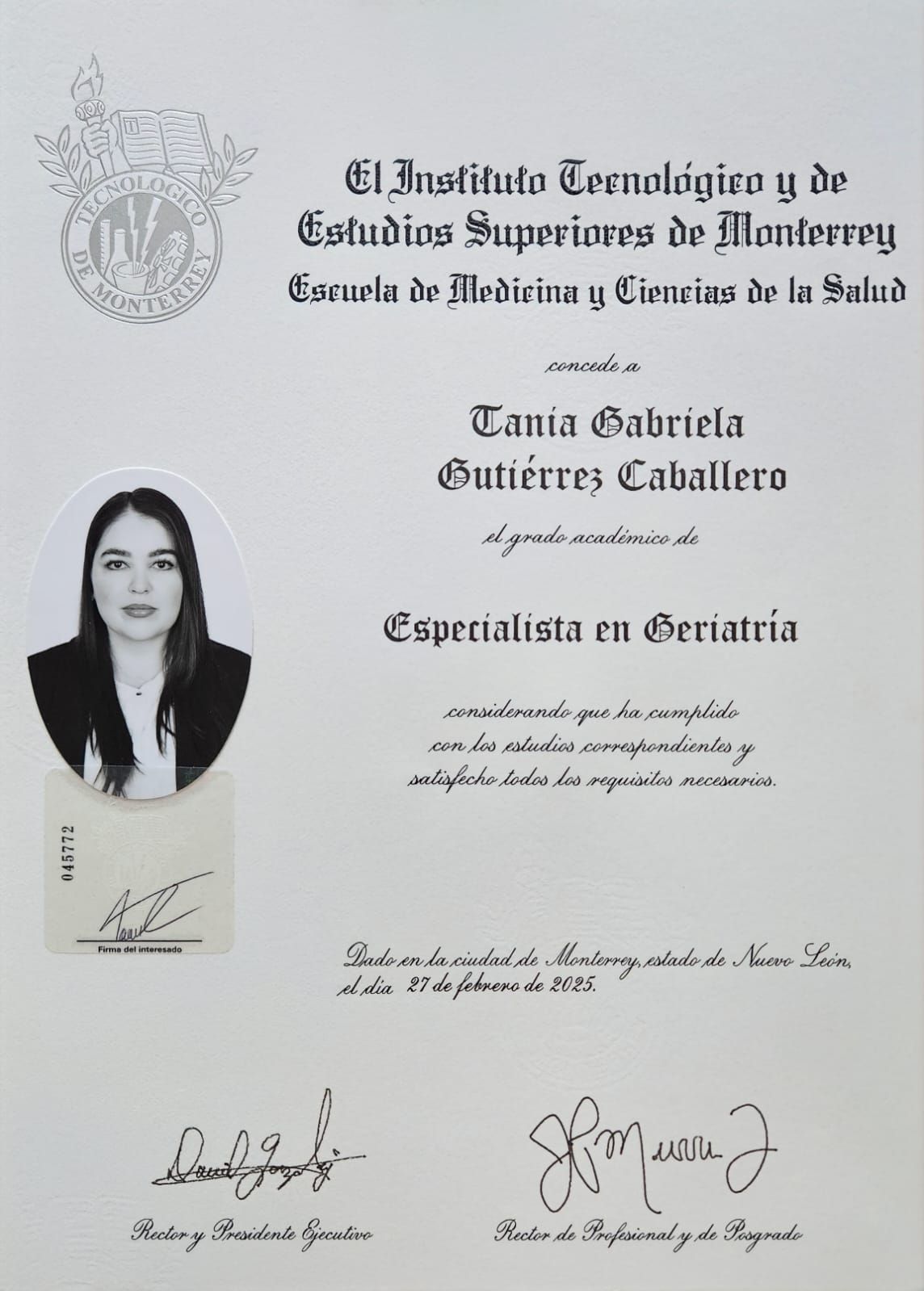 - Especialidad en Geriatría por el Tecnológico de Monterrey